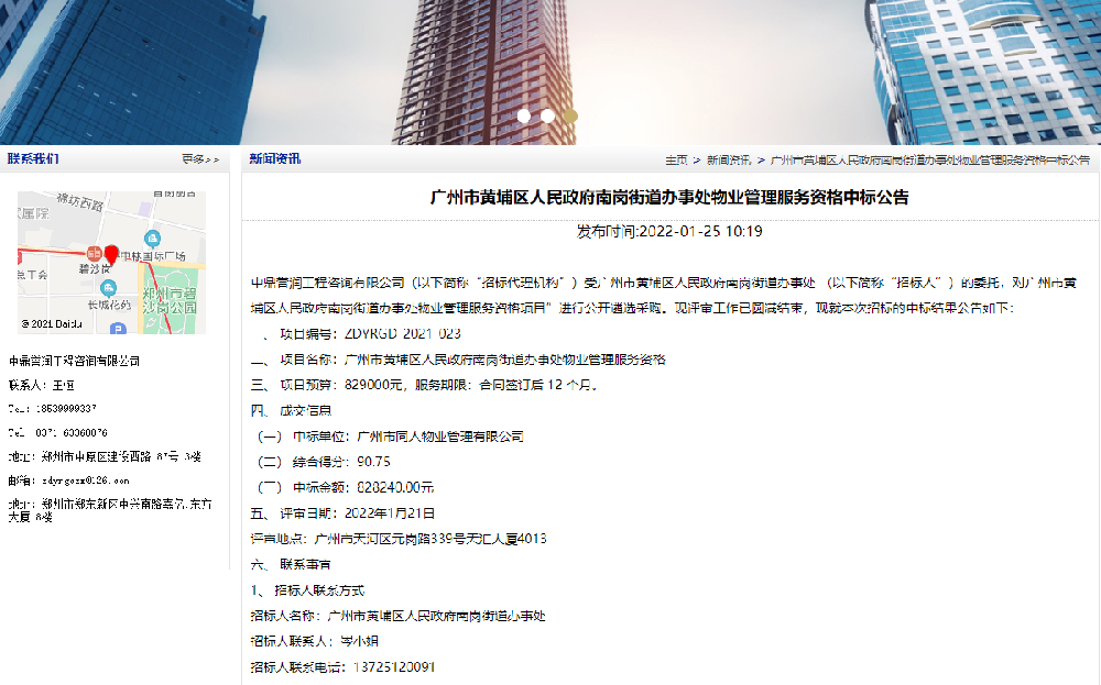 關鍵詞:鼎點娛樂工程咨詢有限公司(以下簡稱“招標代理機構”)受廣州市黃埔區人民政府南崗街道辦事處 (以下簡稱“招標人”)的委托,對廣州市黃埔區人民政府南崗街道辦事處物業管理服務資格項目”進行公開遴選采購,F評審工作已圓滿結束,現就本次招標的中標結果公告如下:一、項目編號:ZDYRGD-2021-023二、項目名[詳細]